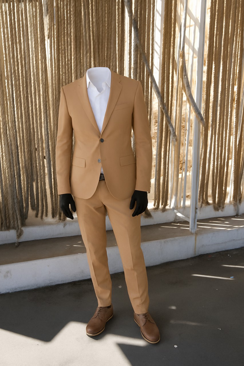 Abito da uomo color miele firmato ACCARDO, composto da giacca e pantalone in tela flex. Eleganza contemporanea, comfort e stile in ogni occasione.